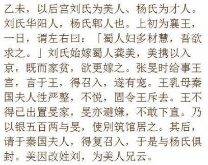 文中记载宋真宗的皇后刘氏,原本是四川籍女性,嫁于银匠龚美为妻子,龚美携刘氏进京,因为生活贫困想把刘氏卖了。适逢当时还是襄王的赵元侃对蜀地女子的才慧颇感兴趣,而襄王的幕僚张旻在见过刘氏的美貌之后就决定将她引荐给襄王。襄王见过刘氏心生欢喜,遂将其买下,并带回宫中宠幸。后来,襄王登基即位,刘氏凭借着襄王的宠爱步步高升,最终从一个改嫁的平民女性成为一国之母: